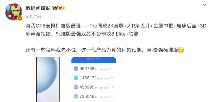 这次 GT8 标准版也一块发,都是在 10 月。据爆料,标准版采用 Pro 同款 2K 大 R 角直屏 + 金属中框 + 玻璃后盖 + 3D 超声波指纹,搭载上一代旗舰芯骁龙 8 Elite,还有独显芯片加持。